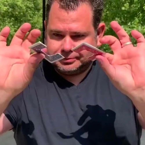 Réalisez ce grand classique devant vos spectateurs, en enclavant les 2 cartes devant eux, à seulement quelques centimètres de leurs yeux.